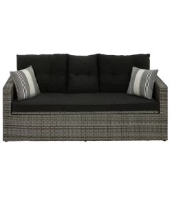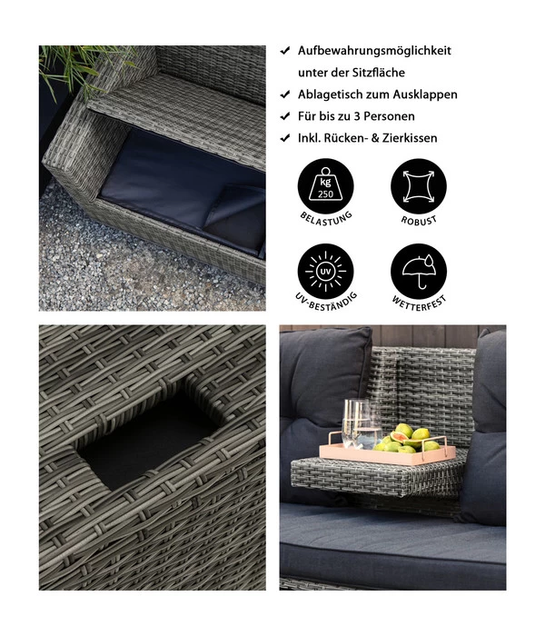 Die Dehner Flecht-Truhenbank ‘Föhr‘ wird Sie mit einem weiteren, nicht alltäglichen Ausstattungsdetail verwöhnen. Sitzen Sie an einem schönen Sommertag gemütlich auf Ihrem neuen Loungesofa und haben plötzlich Lust auf ein kaltes Getränk, klappen Sie einfach aus der Mitte der Rückenlehne eine kleine Ablagefläche heraus, auf der Sie Getränke oder Snacks abstellen können.