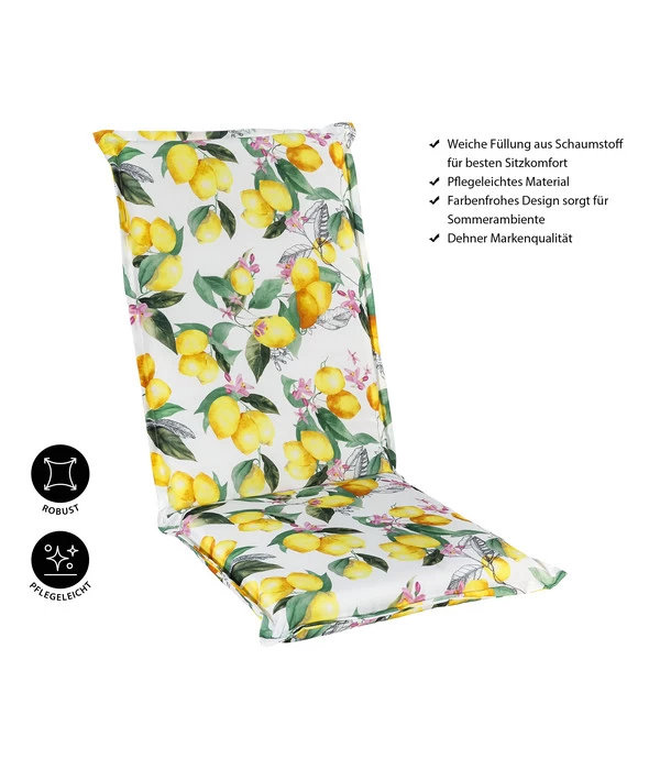 Das Hochlehnerpolster ‚Menton‘ von Dehner prĂ€sentiert sich im wundervollen, farbenfrohen und vielfach kombinierbaren Limonendesign, das an den letzten Urlaub in Bella Italia erinnert und Lust auf den nĂ€chsten Trip macht. Im Sommer sorgen Sie mit dem Polster fĂŒr perfektes Ambiente, ganz gleich, ob es beim Barbecue mit Freunden oder einfach allein bei einem leckeren Cocktail und einem guten Buch sein soll. Dank des Bezugs aus reinem Polyester und der weichen SchaumfĂŒllung aus Polyurethan vereint das Polster eine pflegeleichte Handhabung mit maximaler GemĂŒtlichkeit. Entscheiden Sie sich jetzt fĂŒr das Hochlehnerpolster ‚Menton‘ aus dem Hause Dehner, das Ihnen gewohnte MarkenqualitĂ€t garantiert und zu einer WohlfĂŒhlzeit im AuĂenbereich beitrĂ€gt.
